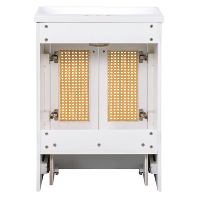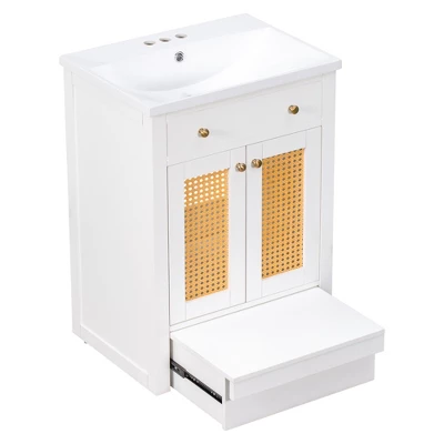 This cabinet comes with soft-closing doors that provide ample storage space, The doors are inlaid with rattan. It looks classic and elegant. It is usually inconvenient for children to use the bathroom cabinet. Because children are not tall enough to reach the sink. The design of the Pull-out footrest solves this problem.