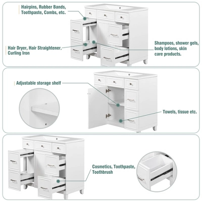 - 【Sufficient Storage Space】Experience the convenience brought by the powerful storage function. One side features an attached drawer for basic bath essentials like a hairdryer, curling iron, straightener and shampoo. On the other side there is a separate drawer dedicated to neatly organizing towels. In addition, the cabinet in the middle provides ample space to store cleaning utensils.