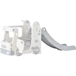 - [4 IN 1 Slide Set] This freestanding slide integrates 4 exciting play sections for kids. The two parts of the slide group have wide step pedals and smooth slides for children to slide down freely. The other part consists of a realistic bus model and a fun basketball hoop. This surprising combination can bring endless play fun to children.