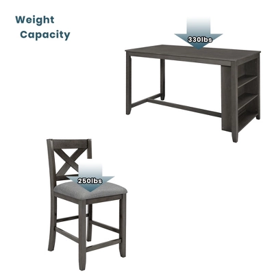 Try this counter height table set when tired of common standard-height ones. In a rustic vintage gray/white finish, there is no doubt that the set will decorate your home with irresistible charm. Come with 4 chairs, this 5-piece dining table set will be a perfect choice for a big family even in small places. All seats for chairs are padded with soft but breathable cushions, which make family or friends dining more relaxing and enjoyable. Worried about lots of odds and ends? Built-in functional storage in this set offers a practical solution for you. With a 3-tier shelf, dishes, bottles, and other stuff have their own places while keeping them in handy.