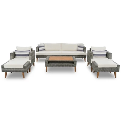 This sofa set is composed of solid wood legs and desktop, hand-woven rattan, and polyester fabric. Includes 1 double seat, 2 single sofas, 2 ottomans, and 1 table. All parts have free positions and distances according to your needs, suitable for simple rest and business conversation. Warm light beige/brown rattan and pillows are also a high-end collocation of the same color. It can be placed in your garden, backyard, poolside and other places. Seating 6 people, it’s the perfect setting to host a party or lounge with the family. And those cushions are made of Sun Umbrella fabric that is waterproof, UV-proof, and corrosion-proof for many years to use. They only need a rag to keep them clean and tidy. While those pillows are equipped with zippers and only need a simple cleaning.
