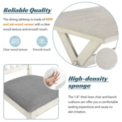 - [Upholstered Chairs] Covered with soft high-density sponges, the 1.8″ thick linen chair and bench cushions can offer you a comfortable seating experience. The backrests of the chairs are hollowed in the middle, which are ergonomically designed.