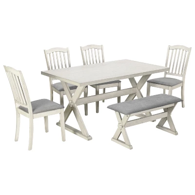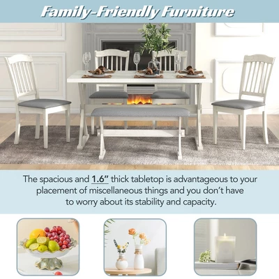 Consisting of 1 dining table, 4 matching chairs, and 1 bench, this 6-piece dining table set can perfectly accommodate your family members within no doubt and can provide a good experience for you and your family to get together. The design takes into account the sense of use and comfort. The spacious and 1.6″ thick tabletop is advantageous to your placement of fruit bowls, vases, candles, etc., and you don’t have to worry about its stability and capacity. Benefiting from its rectangular tabletop and upholstered seating set, this dining set perfectly combines rigidity and softness, which makes its artistic sense stronger. With a surface of a natural ash-wood veneer, the tabletop shows the unique wood grain, thus highlighting unusual texture and flair. Considerate in beautiful lines and retro elements, this dining set reflecting various design aesthetics will bring a rustic-romantic sense to your home.