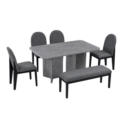 This 6-piece dining table set contains 1 dining table, 4 matching chairs, and 1 bench. It can seat 6 people and can well accommodate your family members and guests. Having a large surface, the 1.3″ thick table leaves enough space for you to advantageously place fruit bowls, vases, candles, etc., and it won’t be crowded. With the appearance of natural marble, the faux marble sticker-covered table highlights the beautiful and natural texture. Refreshingly austere and simple in design, this dining set embodies the modern and minimalist style, which can add a touch of elegance to your dining room, kitchen area, or home bistro.