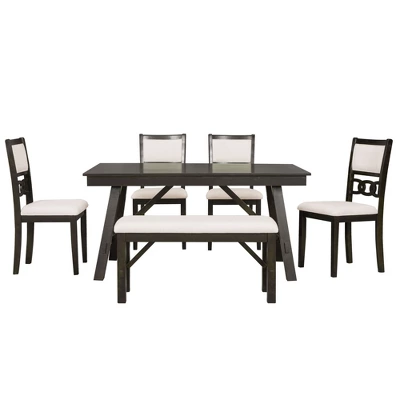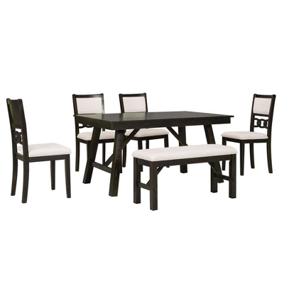 This 6-piece dining set is made of solid wood for exceptional durability. It includes a roomy 59.6-inch table top, support stretcher, and sturdy rubberwood legs. Upholstered chairs with circular decorative backs and a stylish bench complete the set. This set includes 4 chairs and 1 bench, perfect for family gatherings or dinner parties.