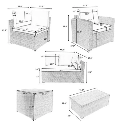 - [Set of 7] This PE rattan sofa set is modern in design, consisting of 1 side armchair, 1 left armchair, 2 right armchairs, 1 left armrest loveseat, 1 rectangular coffee table and 1 square storage Grid composition. In addition, this PE rattan sofa has 13 cushions.