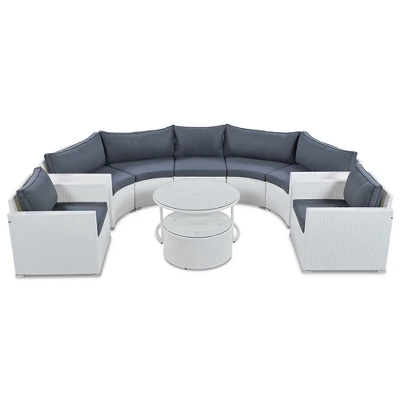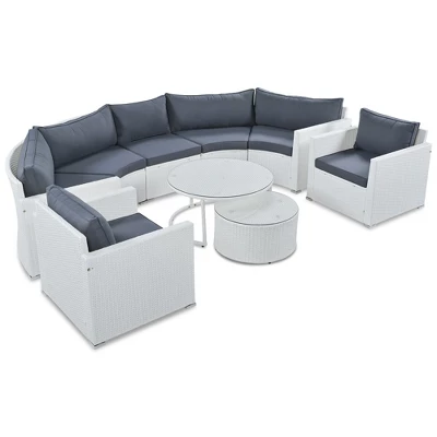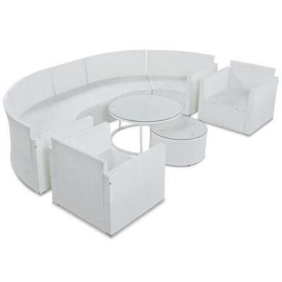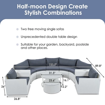 - [Durable Construction] Built with high-quality wicker material and steel parts, the Half-moon Wicker Sofa Set is sturdy and durable while coming with ultra-soft pillows and cushions for added comfort.