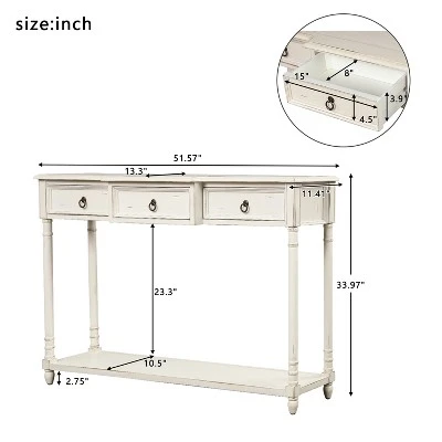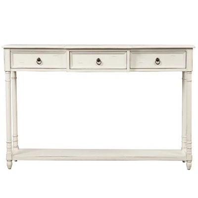 This classic accent table fits perfectly in any living room. Constructed with a solid wood frame and legs with a beautiful distressed finish. It is ensured to be stable, strong and requires low maintenance through long years of use. Features 3 big functional drawers and a fixed lower shelf and a long enough tabletop, this occasional console sofa table helps you to organize your living room necessities, keeping them dust free. What a stylish piece of console table set to elevate your living room or foyer entryway space!