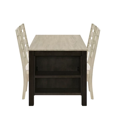 Wow friends or your family with this 5-piece dining table set. Constructed with solid rubberwood legs and premium MDF, this kit combines stability with practicality together. Built with 2-tier side shelves, this dining table can be always organized without sacrificing style to save space. Featured simple clean lines and classical farmhouse style as well as extra storage space and distressed color which will make this dining set a great addition to any home.Table Overall Dimension: 59.8”W x 30.1″D x 29.7″D;Tabletop thickness: 0.8″; Storage Shelf thickness: 1.2″; Storage Shelf depth: 9.5″;Storage Shelf height: 7.5″/10.2″; Chair Overall Dimension: 18.1″W x 18.1″D x 39″ H; Seat depth: 16.5″; Seat height: 17″; Back height: 23.2″.