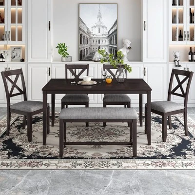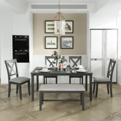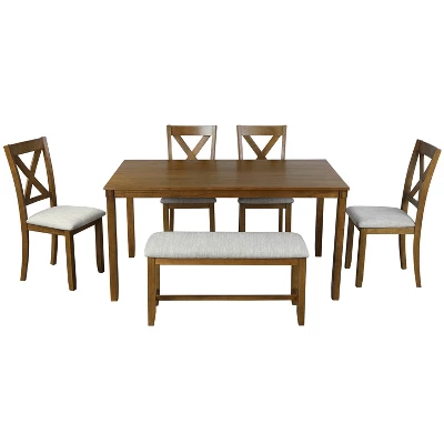 This Rectangular dining table set gives 4 wooden dining chairs, 1 dining table and 1 fabulous dining bench which can fully accommodate your family. Offer a touch of elegance to your dining area with our wooden dining table set.The rectangular table is made of high quality MDF veneer pine while the decorated wooden strips at the edges of both chairs and tabletop help to enhance the solid, traditional feel. This dining set frame and legs are crafted of premium quality rubber real wood to provide fantastic durability and stability. They feature an “X”-shaped curved backrest, burlap cushions and cone-shaped legs, provide maximum comfort and relaxation for your back.