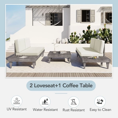 Upgrade your outdoor living space with this 3-piece solid wood patio sofa set. Crafted from high-quality acacia wood with a brushed steel finish, it’s as durable as it is stylish. The set includes two loveseats, each with a side table and a coffee table. With adjustable feet, the set can be easily leveled to any position.