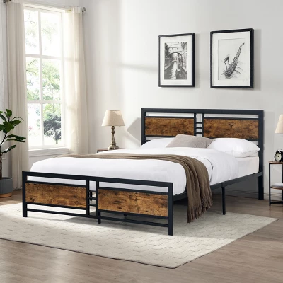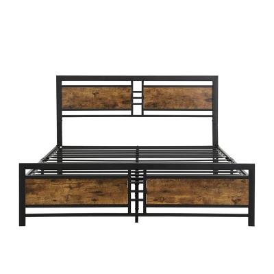 This sophisticated metal platform bed features a wooden headboard and footboard to bring a retro-chic look to your bedroom. Sturdy metal frame construction and slat system add extra stability and safety. The raised bed frame structure can provide you with free storage space under the bed, making it easier for you to store and clean, keeping your bedroom tidy and orderly.