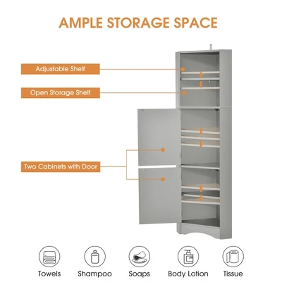 - [Adjustable Shelves] This corner cabinet includes two removable shelves that allow you to divide your storage space. What’s more, each shelf can be adjusted to different heights according to the pre-drilled holes. It fully meets the family storage needs.