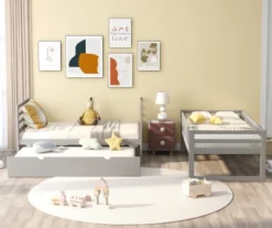 Made from high-quality solid pinewood & composites, the Solid Hardwood Twin Bunk Bed features unique fastening systems, a sturdy 4-step ladder & full-length guardrails. This bunk bed can also be configured into two separate twin beds for the ultimate versatility. Its understated charm will last for years to come. This bunk bed is equipped with a movable trundle design, and 4 wheels make it easier to pull out. You can utilize the trundle bed as an underside storage bin for an easy clutter-combating solution.