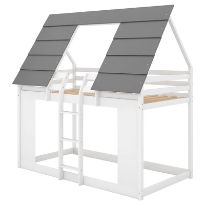 - [House Design] Featuring a pitched roof and wall section with a window, these house-shaped bunk beds create a fun and adorable space that not only serves as a comfortable sleeping area but also doubles as a space for your little ones to play and have fun.