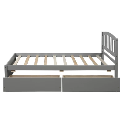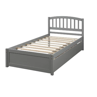 Spend your nights comfortably and in style with this stylish and functional twin-sized wooden bed frame. Including aesthetically pleasing head and footboards and boasting clean, curvaceous lines, this frame is as beautiful as it is useful. Including two extra-large storage drawers on sleek casters, and boasting extra storage space and an all-wood design, this bed frame is built to last. Extra storage space is included opposite the drawer which is also great for placing your shoes or even traveling suitcases. Three baffles under the bed can prevent the drawers from running around.